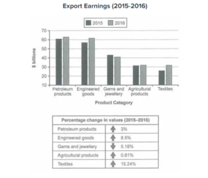 The bar graph displays how much one nation’s exports in 5 different categories were worth in 2015 and 2016, while the table illustrates how much export values for the 5 categories changed in percentage terms in 2016 as compared to 2015.