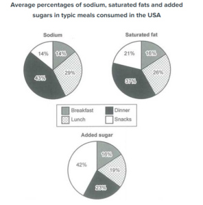 The pie charts display the average proportions of 3 categories of nutrients consumed in typical meals, all of which may be harmful to health if over-consumed.