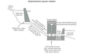 The diagram below shows how electricity is generated in a hydroelectric power station.