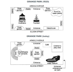 The maps display the layout of a public park called Grange Park when it initially opened in 1920, and how it looks now.