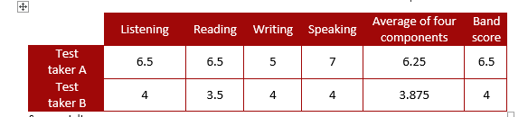 In the IELTS, 2019 result a candidate achieving 4.0 for Listening, 3.5 for Reading, 4.0 for Writing and 4.0 for Speaking would be awarded an Overall Band Score of 4.0 (15.5/4 =3.875= Band 4.0). On the other hand, a candidate achieving 6.5 for Listening, 6.5 for Reading, 5.5 for Writing and 6.0 for Speaking would be awarded the band 6.0 (24.5/4 = 6.125 = Band 6) in the IELTS result 2019. Same way you can do the calculations for your bands.